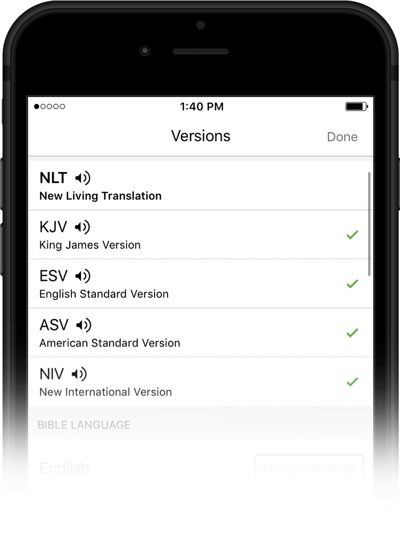 | Audio Bibles help you engage with Scripture, no matter what you're doing. Having trouble seeing this email? View it online. | | | Let the Bible App read to you. Many early Christians were only able to experience portions of the Bible. One person would read aloud to a group, sharing passages from a handwritten copy of the text. Today our smartphones give us hundreds of complete Bibles in our pockets. And the audio versions of many of these can actually "read" to us from God's inspired Word! The Bible App helps you engage more with Scripture, no matter what you're doing: exercising, getting ready for work, on your commute…even reading along.1 | | Customize your listening experience. | | Standard play, rewind, and fast forward controls. | | Skip backward or forward, one verse at a time. | | Select the playback speed you want. | | Show or hide a "floating" play/pause button over the Bible text, which lets you begin listening with just one tap. | | Set the playback time, and make God's Word the soundtrack to whatever you're doing. | | | | | Start here. | | Tap the speaker icon. Inside the Bible App, when you see a speaker icon in the menu above the Bible text, tap it, then tap Play. If you don't see a speaker icon above the Bible version you're reading… | | Switch versions. Tap the version abbreviation at the top of the app. Select any version with a speaker icon next to it. When you return to the Bible reader, tap the speaker icon. | | | Open the App | | | | Note: Before you try any Bible App feature for the first time, it's always a good idea to ensure that you have the most up-to-date version at bible.com/app. | | 1 | Listening while connected to Wi-Fi does not use your mobile data plan. | | | | | |